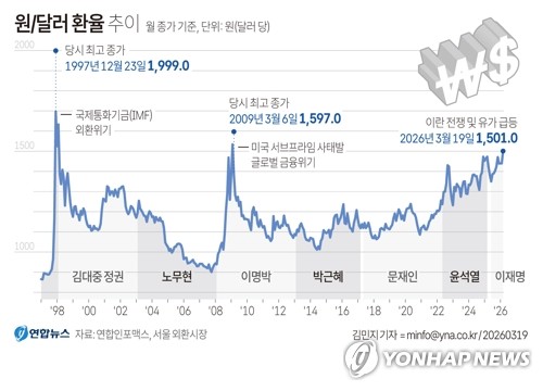 (서울=연합뉴스) 한지훈 기자 = 이란 전쟁 격화 속에 유가 급등, 달러 강세 등 악재가 겹치면서 19일 원/달러 환율이 금융위기 이후 최고 수준으로 치솟았다.