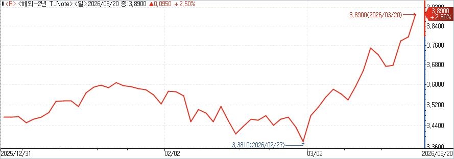 미국채 2년물 수익률이 전쟁 발발 직전 3.4% 수준이었던 점을 고려하면 약 3주 새 금리가 0.50%포인트 오른 셈이다.