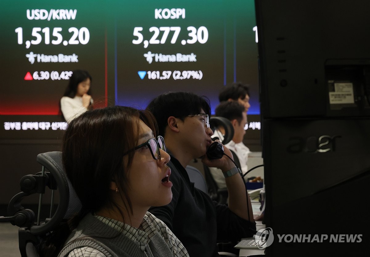 (서울=연합뉴스) 신준희 기자 = 30일 서울 중구 하나은행 본점 딜링룸 전광판에 코스피 종가와 원/달러 환율이 표시돼 있다. 이날 코스피는 전장보다 161.57포인트(2.97%) 내린 5,277.30에 장을 마쳤다. 원/달러 환율은 6.8원 오른 1,515.7원을 기록했다. 2026.3.30 hama@yna.co.kr