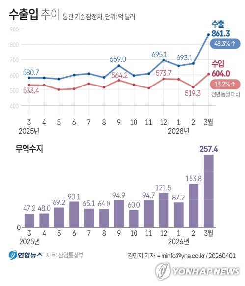 김정관 산업부 장관은 "3월 수출은 중동 전쟁과 보호무역 확산 등 엄중한 대외 여건에도 불구하고 반도체를 중심으로 하는 주력 품목과 소비재 등 유망 품목의 고른 증가에 힘입어 사상 처음 800억달러를 돌파했다"며 "중동 전쟁 장기화로 수출 여건의 불확실성이 확대되고 있는 만큼 범정부 대응체계를 가동해 안정화 조치를 신속히 추진하겠다"고 말했다.