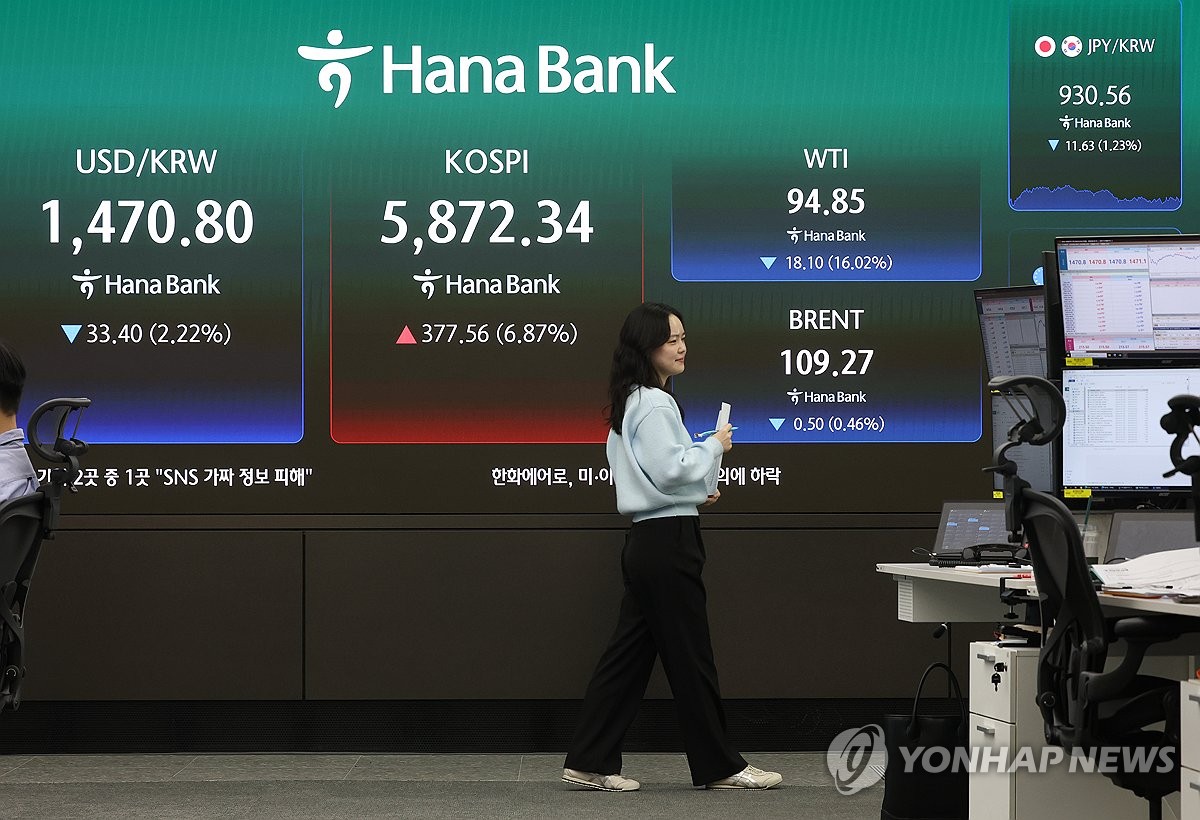 (서울=연합뉴스) 이지은 기자 = 미국과 이란이 2주간의 휴전에 사실상 합의한 가운데 8일 서울 중구 하나은행 본점 딜링룸 현황판에 코스피지수 등이 표시돼 있다. 이날 코스피는 전장 대비 377.56포인트(6.87%) 오른 5,872.34로, 코스닥 지수는 53.12포인트(5.12%) 오른 1,089.85로 마감했다. 2026.4.8 jieunlee@yna.co.kr