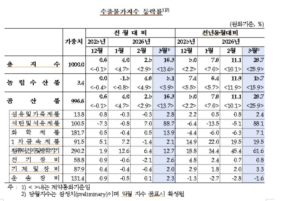 3월 수출물가지수(원화 기준)도 전월(149.50)보다 16.3% 높은 173.86으로 집계됐다. 역시 9개월째 상승세일 뿐 아니라 1998년 1월(23.2%) 이후 28년 2개월 만에 최고 상승률이다.