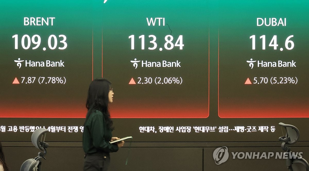 실제로 두바이 유가(월평균·배럴당)는 2월 68.40달러에서 3월 128.52달러로 87.9% 뛰었다. 원/달러 환율(월평균) 역시 한 달 사이 1,449.32원에서 1,486.64원으로 2.6% 올랐다.