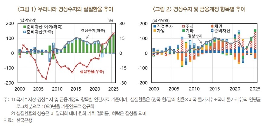 과거엔 경상수지로 축적된 대외자산은 대부분 중앙은행의 외환보유액 등 준비자산의 형태로 축적됐으나, 2010년대 이후엔 준비자산 외 대외자산이 급증했다.