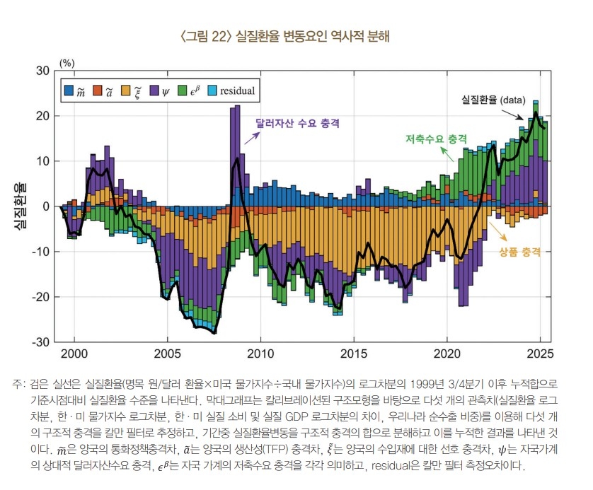 김 과장은 "저축수요 충격은 2011년 이후 실질환율의 완만한 추세적 상승에 기여했다"면서 "반면 상품 충격은 2000년대 및 2010년대에는 원화 절상에 기여했으나, 최근에는 그 영향력이 크게 약화했다"고 설명했다.