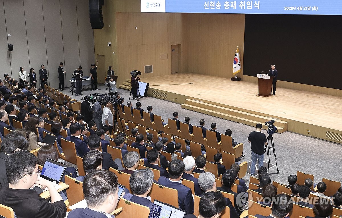 (서울=연합뉴스) 김인철 기자 = 신현송 한국은행 총재가 21일 서울 중구 한국은행 별관에서 열린 취임식에서 취임사를 하고 있다. 2026.4.21 [공동취재] yatoya@yna.co.kr