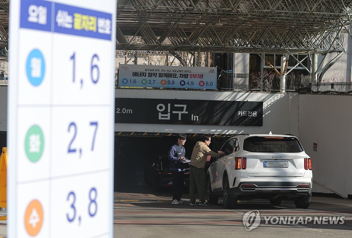 (서울=연합뉴스) 류영석 기자 = 공영주차장 차량 5부제가 실시된 8일 서울 종로구 종묘 공영주차장에서 서울시설공단 관계자들이 5부제 안내를 하고 있다. 2026.4.8 ondol@yna.co.kr