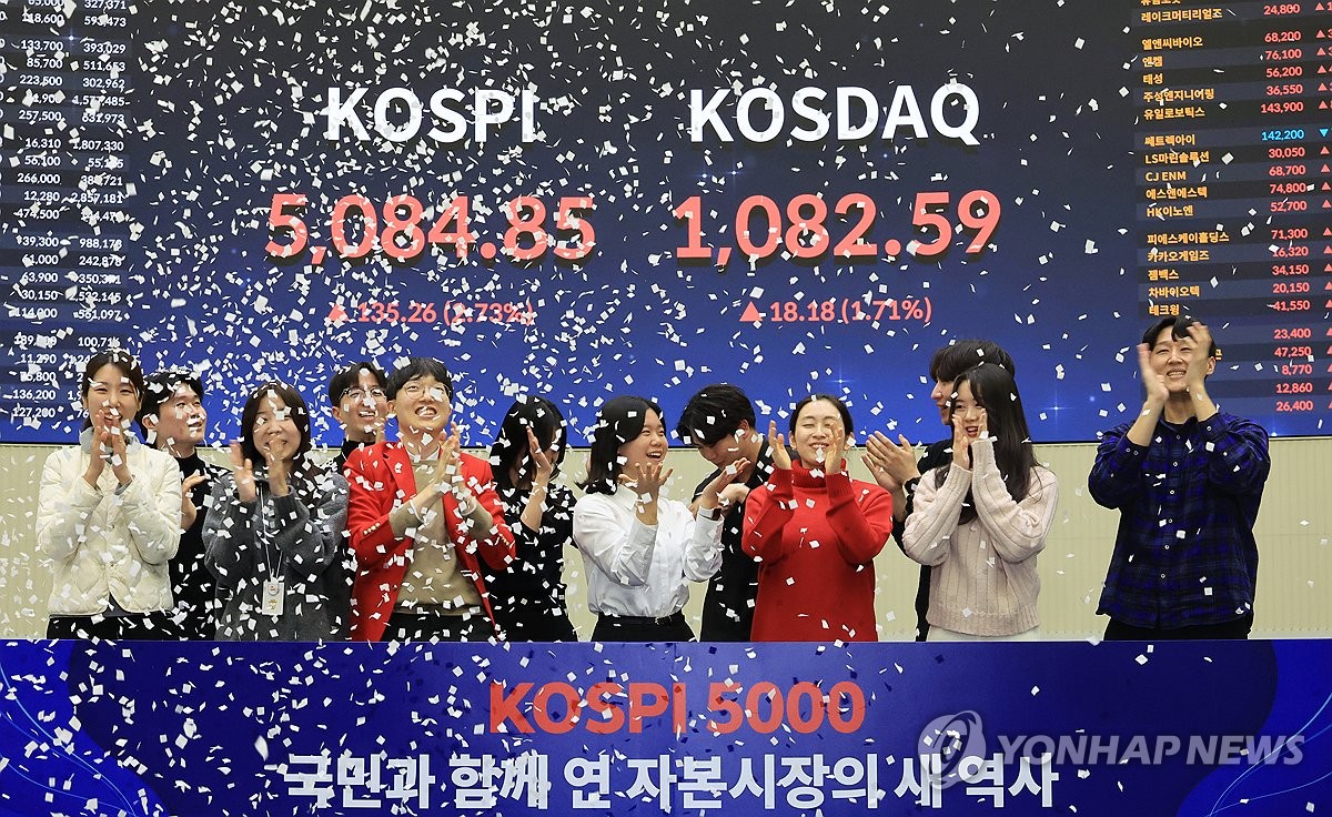 (서울=연합뉴스) 최재구 기자 = 코스피가 종가 기준 5,000포인트, 코스닥이 1,000포인트를 돌파한 27일 서울 여의도 KRX한국거래소에서 직원들이 축하 세리머니를 하고 있다. 2026.1.27 jjaeck9@yna.co.kr