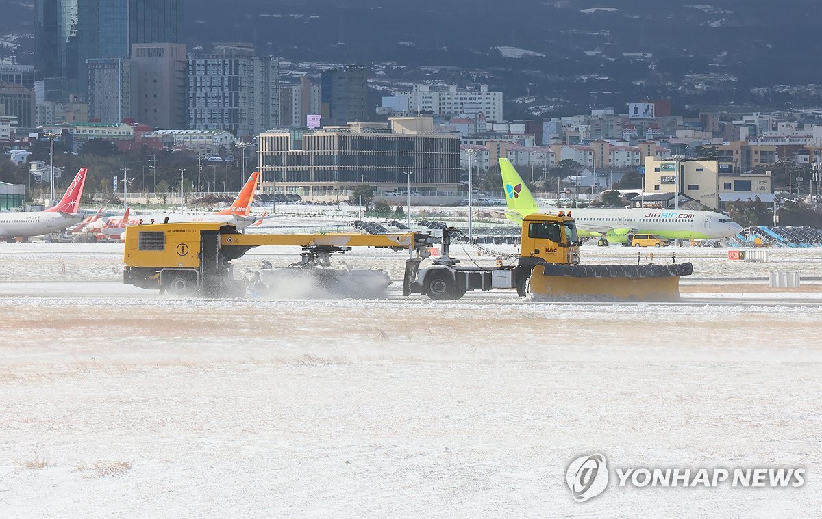 제주공항은 "이날 새벽 시간대 강설과 눈 폭풍으로 인해 항공기 이동지역 제설작업을 위해 관계기관 협의결과에 따라 잠정 오전 10시까지 활주로 운영을 중지할 예정"이라고 밝혔다.