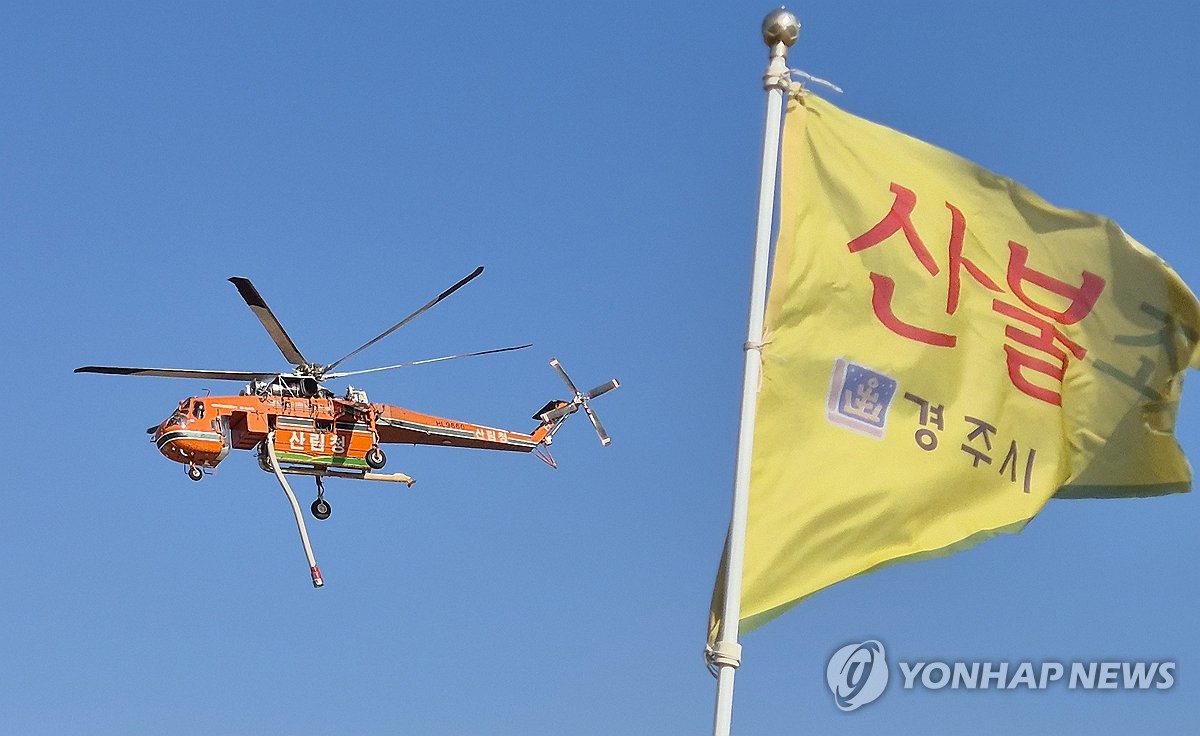 (경주=연합뉴스) 손대성 기자 = 8일 오후 경북 경주시 문무대왕면 일대에서 소방헬기가 산불 진화작업을 벌이고 있다. 전날 문무대왕면 입천리에서 발생한 산불은 이날까지 이어지고 있다. 2026.2.8 sds123@yna.co.kr