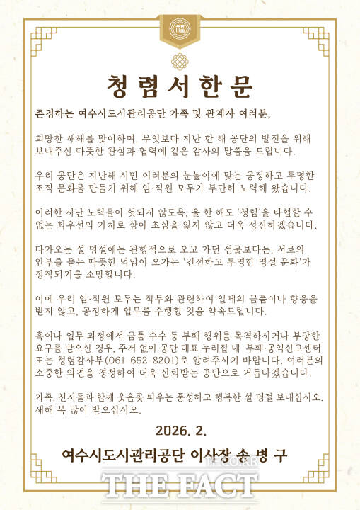 여수시도시관리공단, 설 앞두고 청렴서한문 발송
