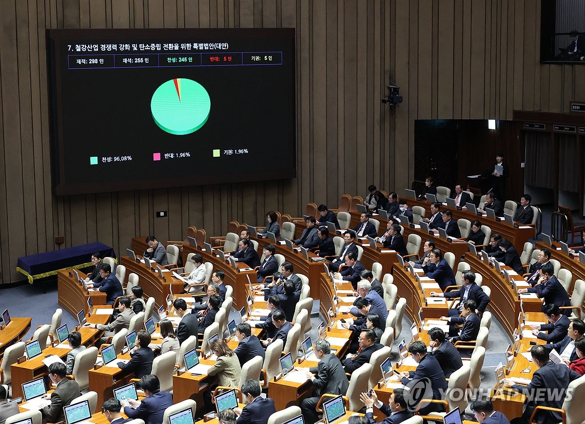 (서울=연합뉴스) 류영석 기자 = 27일 국회 본회의에서 철강산업 경쟁력 강화 및 탄소중립 전환을 위한 특별법안(K-스틸법)이 통과되고 있다. 2025.11.27 ondol@yna.co.kr