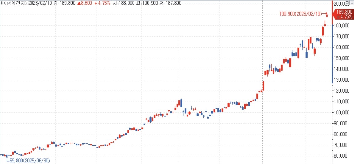 이로써 삼성전자는 사상 처음으로 19만원 선을 돌파했다. 직전 최고가는 설 연휴 전 마지막 거래일이었던 지난 13일 기록한 18만4천400원이다.