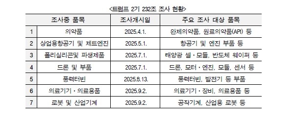 무협은 이미 미국 정부가 지난해 무역확장법 232조를 근거로 의약품, 항공기·제트엔진, 드론, 풍력터빈, 로봇·산업기계 등에 대한 조사에 착수한 것을 지적하면서 "이에 더해 반도체 및 파생상품에 대한 관세 조치를 확대·강화될 가능성에도 대비해야 한다"고 했다.