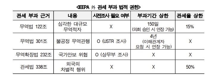 무협은 트럼프 대통령이 무역법 122조를 통해 모든 국가·수입품에 글로벌 관세 15%를 부과한 데 이어 이 관세의 최대 부과 기간인 150일 안에 무역법 301조 및 무역확장법 232조 등에 의한 조사를 진행해 새로운 관세를 부과할 가능성에도 대비할 것을 주문했다.