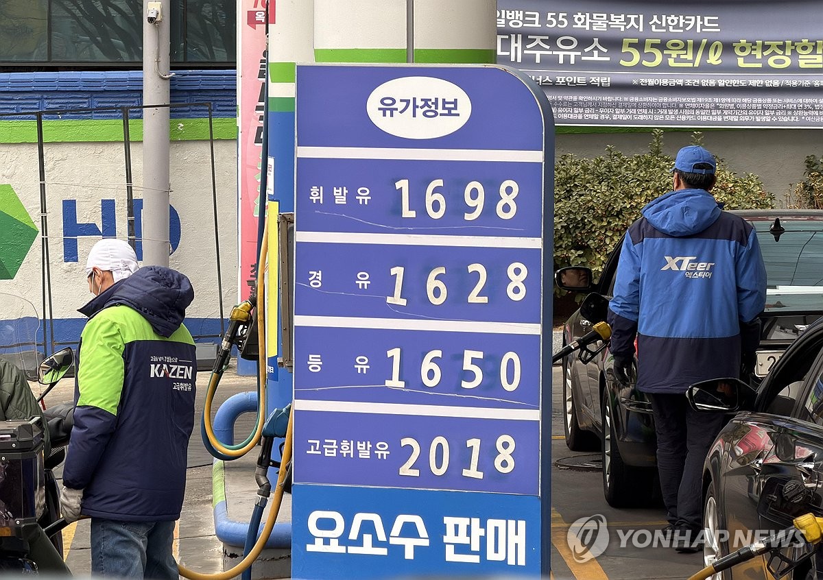 (서울=연합뉴스) 이재희 기자 = 22일 서울 시내 한 주유소 앞에 휘발유 가격이 게시돼 있다. 2월 셋째 주(15∼19일) 전국 주유소 휘발유 평균 판매가는 지난주보다 ℓ당 2.0원 오른 1천688.3원이었다. 2026.2.22 scape@yna.co.kr