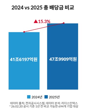 24일 리더스인덱스가 국내 주요 상장사 694개의 배당 현황을 분석한 결과, 이들 기업의 2025년 전체 배당금은 47조9천909억원으로 전년(41조6천197억원) 대비 15.3%(6조3천712억원) 증가한 것으로 집계됐다.