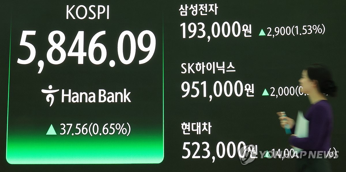 (서울=연합뉴스) 최재구 기자 = 23일 서울 중구 하나은행 본점에서 직원이 증시 전광판 앞을 지나고 있다. 이날 코스피는 37.56p(0.65%) 오른 5,846.09로 장을 마쳤다. 2026.2.23 jjaeck9@yna.co.kr