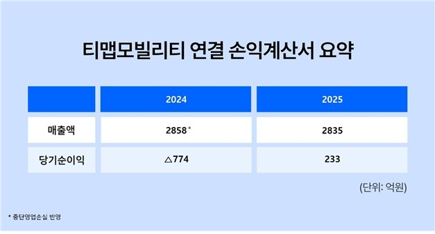 티맵모빌리티는 데이터와 AI 중심의 사업 구조 전환 성과로 작년 연간 실적에서 상각전영업이익(EBITDA)과 당기순이익 모두 흑자로 전환했다고 밝혔다. 두 지표가 각각 흑자 전환한 건 이번이 처음이다.