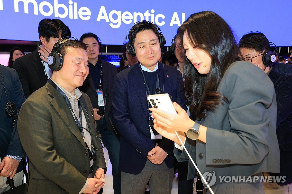 (서울=연합뉴스) 홍범식 LG유플러스 대표가 2일(현지시간) 스페인 바르셀로나 피라 그란 비아 전시장에서 열린 '모바일 월드 콩그레스(MWC)2026'에서 삼성전자 갤럭시 부스를 방문해 노태문 삼성전자 대표이사 사장(DX부문장)과 갤럭시 S26 울트라에 대한 설명을 듣고 있다. 2026.3.3 [사진공동취재단] photo@yna.co.kr