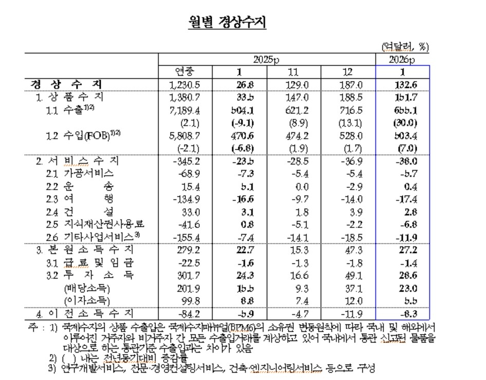 한국은행이 6일 발표한 국제수지 잠정 통계에 따르면 올해 1월 경상수지는 132억6천만달러(약 19조7천억원) 흑자로 집계됐다. 2000년대 들어 두 번째로 긴 33개월 연속 흑자 기조를 유지했고, 월간 흑자 규모 기준으로 역대 5위 기록이다.