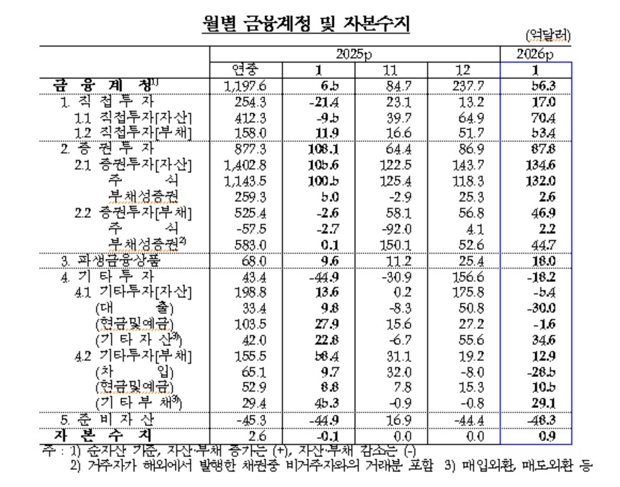 증권투자에서는 내국인의 해외투자가 주식을 중심으로 134억6천만달러, 외국인의 국내 투자도 채권 위주로 46억9천만달러 각각 늘었다. 미국 증시 관련 투자심리 호조 등에 특히 내국인의 해외 주식투자 증가 폭(132억달러)이 역대 두 번째로 컸다.