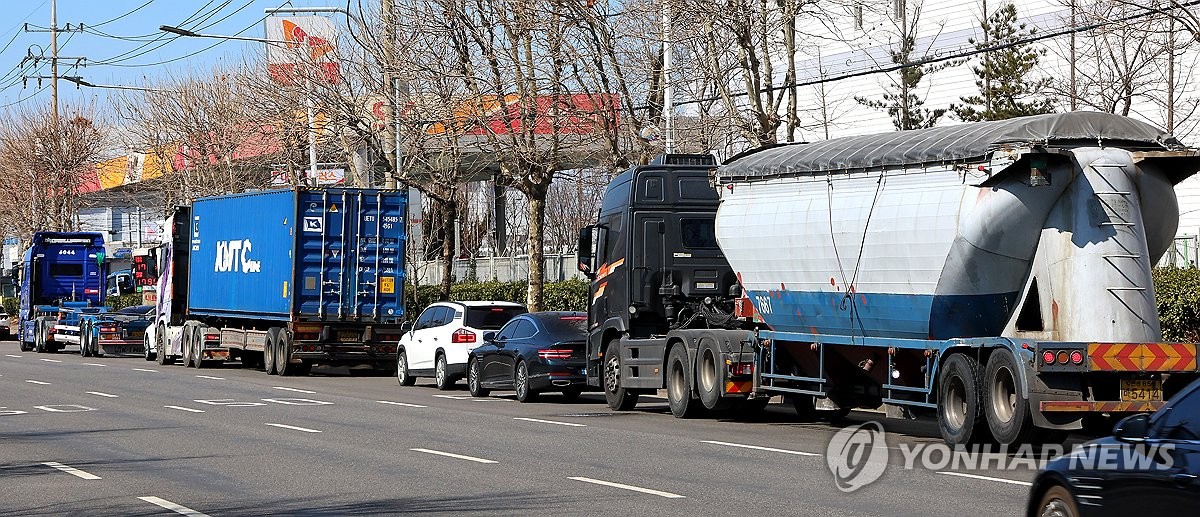 (인천=연합뉴스) 임순석 기자 = 미국과 이스라엘의 이란 공습 여파로 국내 주유소 휘발유와 경유 가격이 가파르게 상승하고 있는 가운데 7일 인천 중구의 한 주유소 앞에 저렴한 가격의 주유소를 찾는 대형화물차량과 승용차들이 늘어 서 있다. 2026.3.7 soonseok02@yna.co.kr
