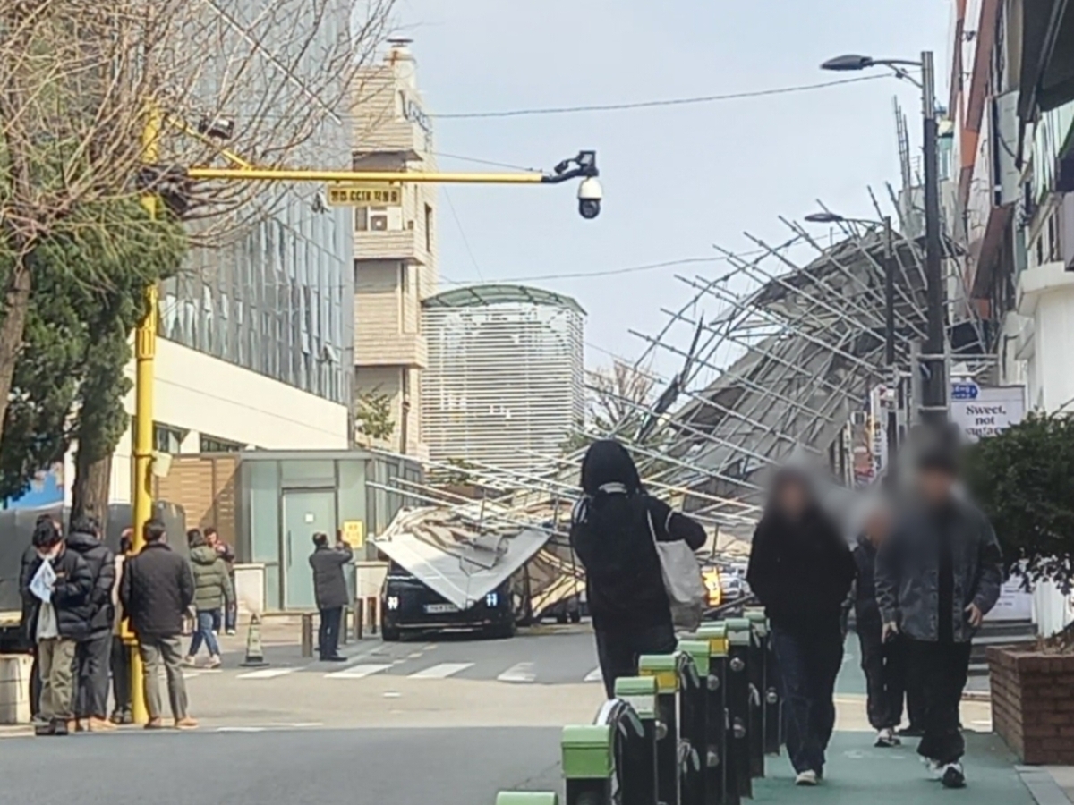 (서울=연합뉴스) 최원정 기자 = 9일 낮 12시 55분께 서울 강남구 신사동 압구정역 인근 건물 리모델링 공사 현장에서 건물 외벽 비계가 무너졌다.
