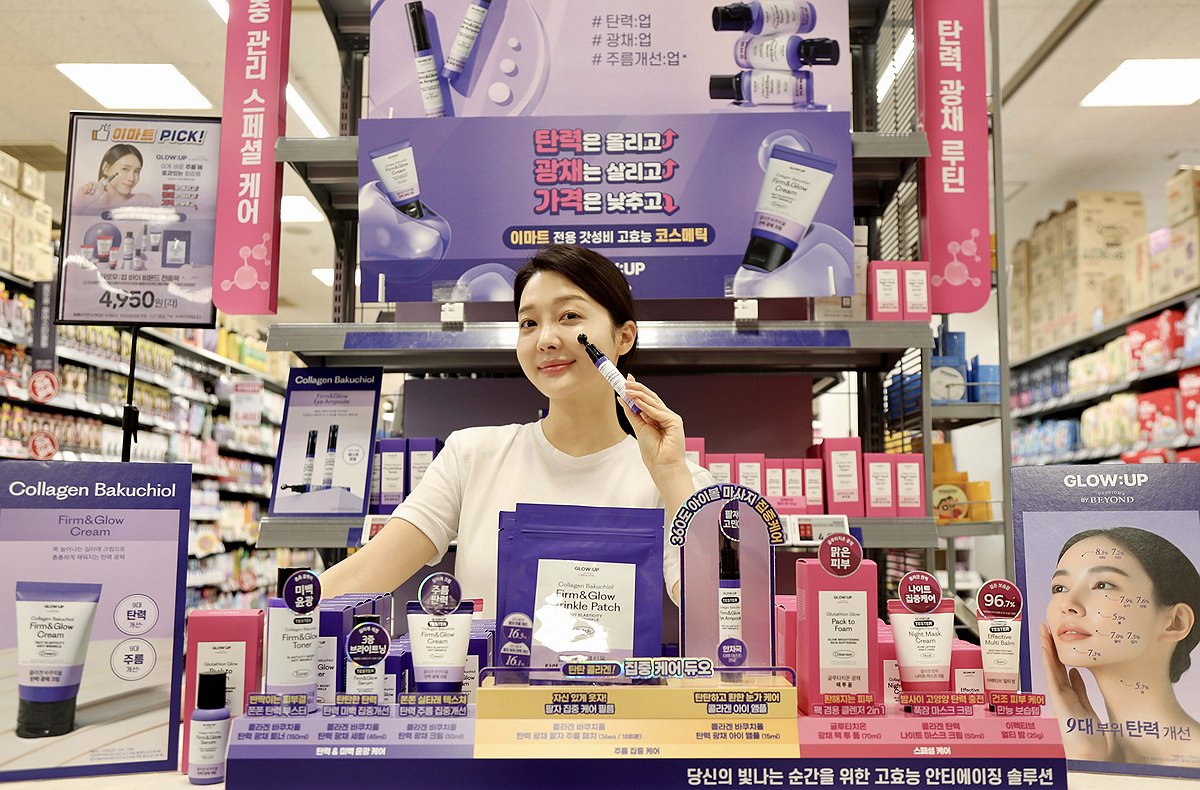 (서울=연합뉴스) 이마트가 LG생활건강과 손잡고 '비욘드'의 신규 스킨케어 라인 '글로우:업 바이 비욘드'를 론칭, 초저가 화장품 판매에 나섰다고 21일 밝혔다. 모델이 '글로우:업 바이 비욘드'를 소개하고 있다. 2025.4.21 [이마트 제공. 재판매 및 DB 금지] photo@yna.co.kr