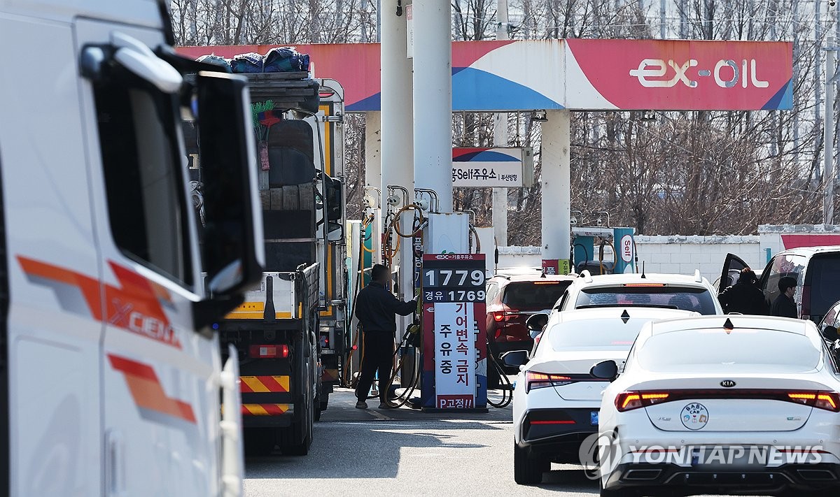 (광주=연합뉴스) 조남수 기자 = 석유 최고가격제 시행 첫날인 13일 광주 서구 치평동에서 주유하려는 차량이 저렴한 가격의 주유소에 몰려 있다. 2026.3.13 iso64@yna.co.kr