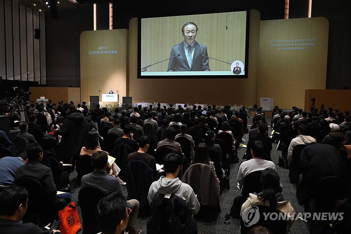 (수원=연합뉴스) 홍기원 기자 = 18일 경기도 수원시 영통구 수원컨벤션센터에서 열린 제57기 삼성전자 정기주주총회에서 의장을 맡은 전영현 삼성전자 대표이사 부회장 겸 DS부문장이 인사말을 하고 있다. 2026.3.18 [공동취재] xanadu@yna.co.kr