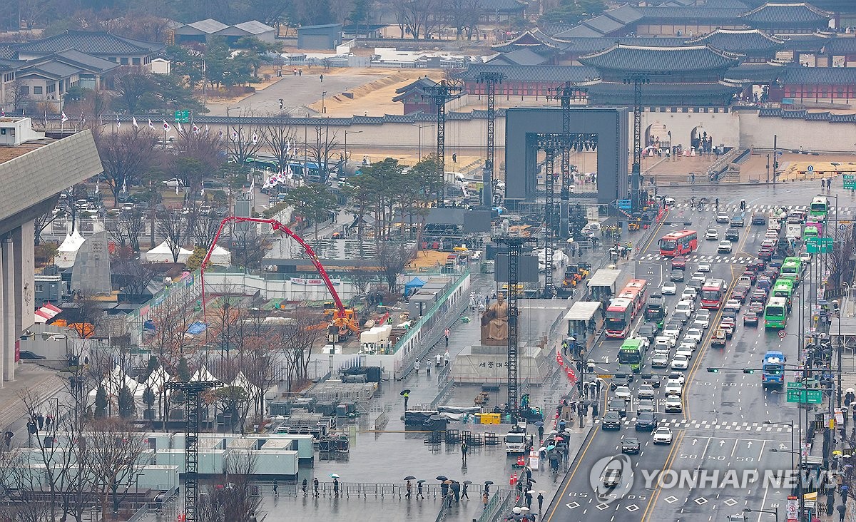 (서울=연합뉴스) 류영석 기자 = 그룹 방탄소년단(BTS)의 광화문 공연을 앞둔 18일 서울 광화문광장에서 공연 준비작업이 이뤄지고 있다. 2026.3.18 ondol@yna.co.kr