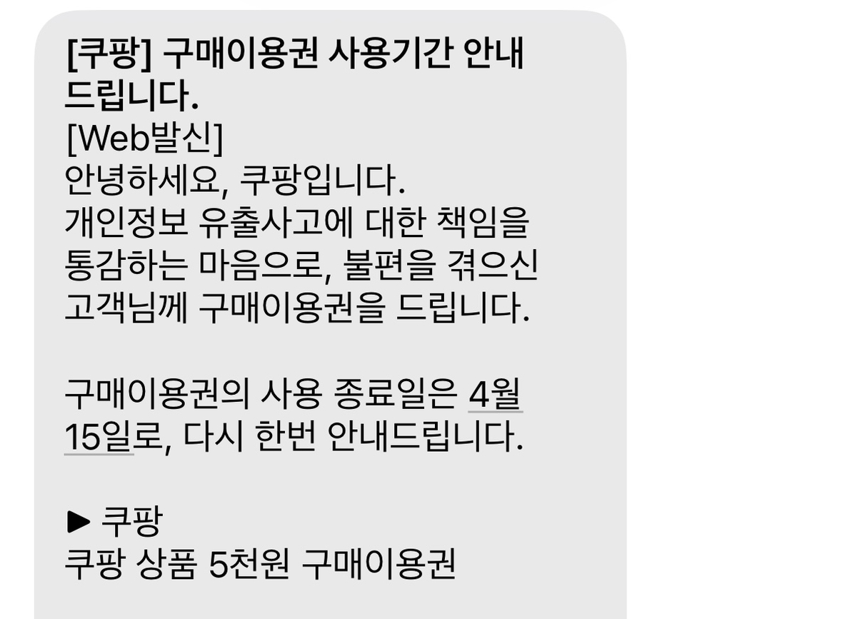 쿠팡은 전날에도 개인 정보가 유출된 소비자들에게 문자를 보내 "개인정보 유출 사고에 대한 책임을 통감하는 마음으로, 불편을 겪으신 고객님께 구매이용권을 드린다"며 쿠폰의 유효기간이 다음 달 중순까지라면서 사용을 유도했다.