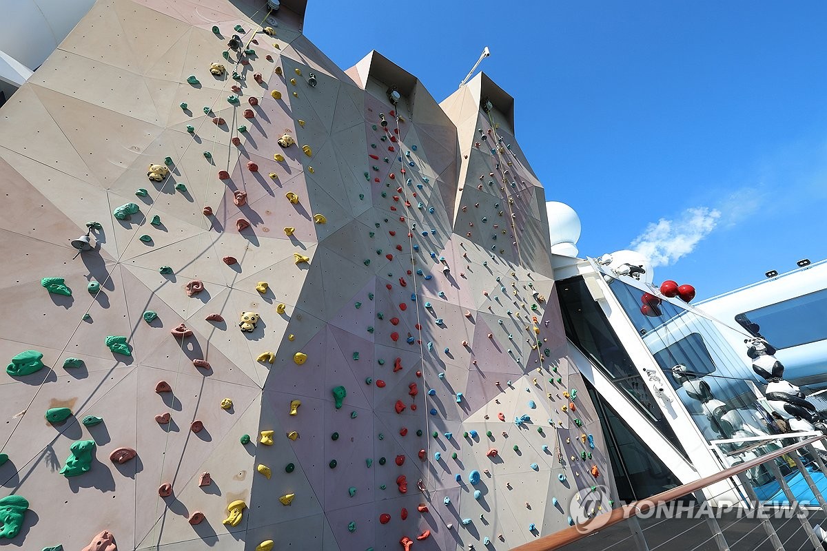 (인천=연합뉴스) 임순석 기자 = 19일 인천 연수구 인천항 국제크루즈터미널에 정박한 로얄캐리비안 크루즈의 '스펙트럼 오브 더 시즈(17만t급)'호가 언론인 등을 대상으로 팸투어를 실시했다. 사진은 올해 인천항에 처음 기항한 크루즈 '스펙트럼 오브 더 시즈'호 선내 인공 암벽장의 모습. 2026.3.19 soonseok02@yna.co.kr