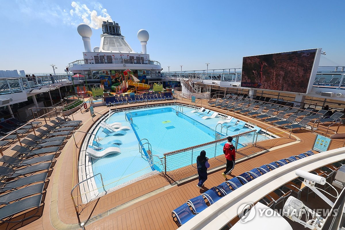 (인천=연합뉴스) 임순석 기자 = 19일 인천 연수구 인천항 국제크루즈터미널에 정박한 로얄캐리비안 크루즈의 '스펙트럼 오브 더 시즈(17만t급)'호가 언론인 등을 대상으로 팸투어를 실시했다. 사진은 올해 인천항에 처음 기항한 크루즈 '스펙트럼 오브 더 시즈'호 선내 야외수영장 모습. 2026.3.19 soonseok02@yna.co.kr