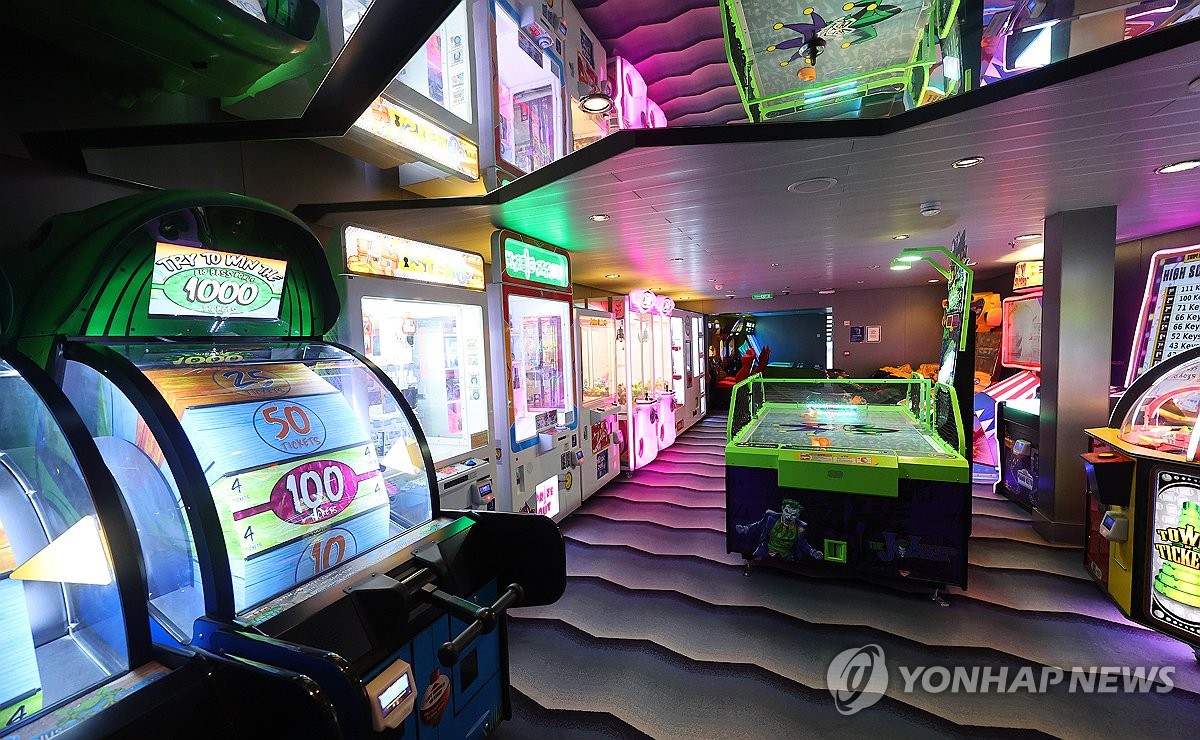 (인천=연합뉴스) 임순석 기자 = 19일 인천 연수구 인천항 국제크루즈터미널에 정박한 로얄캐리비안 크루즈의 '스펙트럼 오브 더 시즈(17만t급)'호가 언론인 등을 대상으로 팸투어를 실시했다. 사진은 올해 인천항에 처음 기항한 크루즈 '스펙트럼 오브 더 시즈'호 선내 오락실 모습. 2026.3.19 soonseok02@yna.co.kr