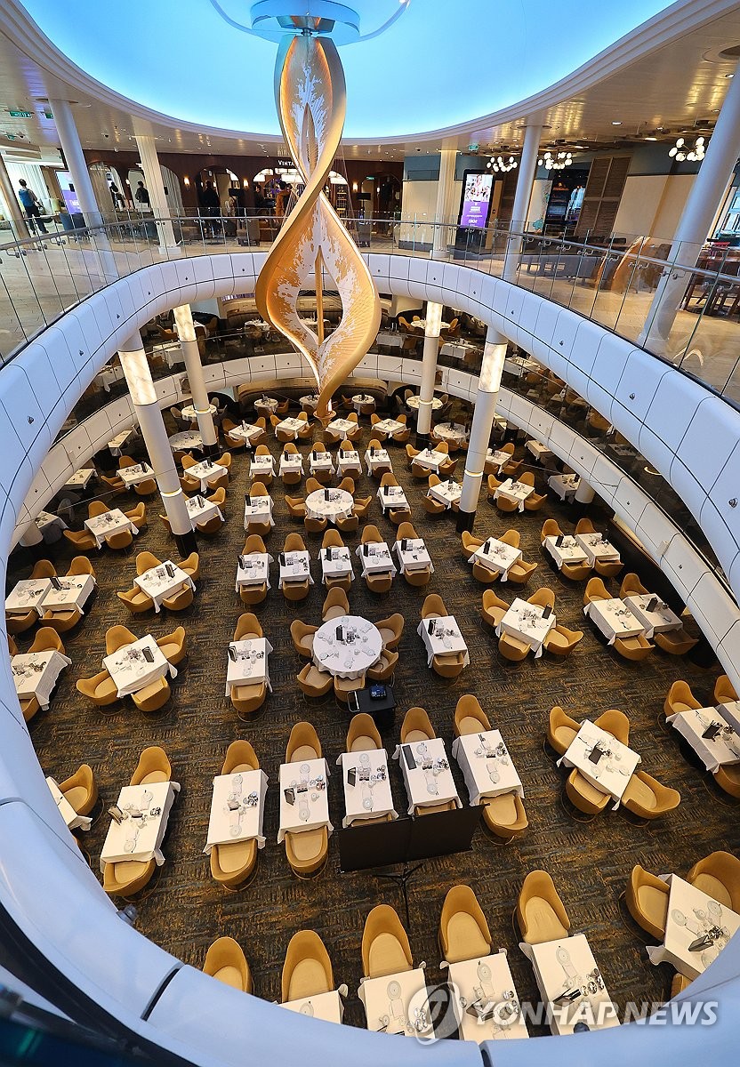 (인천=연합뉴스) 임순석 기자 = 19일 인천 연수구 인천항 국제크루즈터미널에 정박한 로얄캐리비안 크루즈의 '스펙트럼 오브 더 시즈(17만t급)'호가 언론인 등을 대상으로 팸투어를 실시했다. 사진은 올해 인천항에 처음 기항한 크루즈 '스펙트럼 오브 더 시즈'호 선내 정찬 식당의 모습. 2026.3.19 soonseok02@yna.co.kr