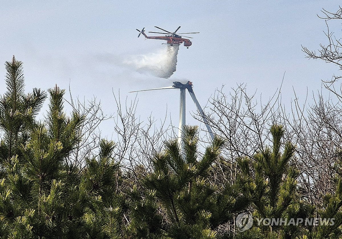 (영덕=연합뉴스) 손대성 기자 = 23일 오후 1시 11분께 경북 영덕군 영덕읍 창포리 풍력발전단지 내 한 풍력발전기에서 불이 난 가운데 현장에서 헬기가 진화작업을 하고 있다. 2026.3.23 sds123@yna.co.kr