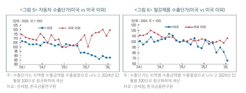 반면 미국 이외 지역 자동차 수출 단가는 같은 기간에 오히려 올라 지난해 말 전년 동월 대비 12.8% 상승했다.