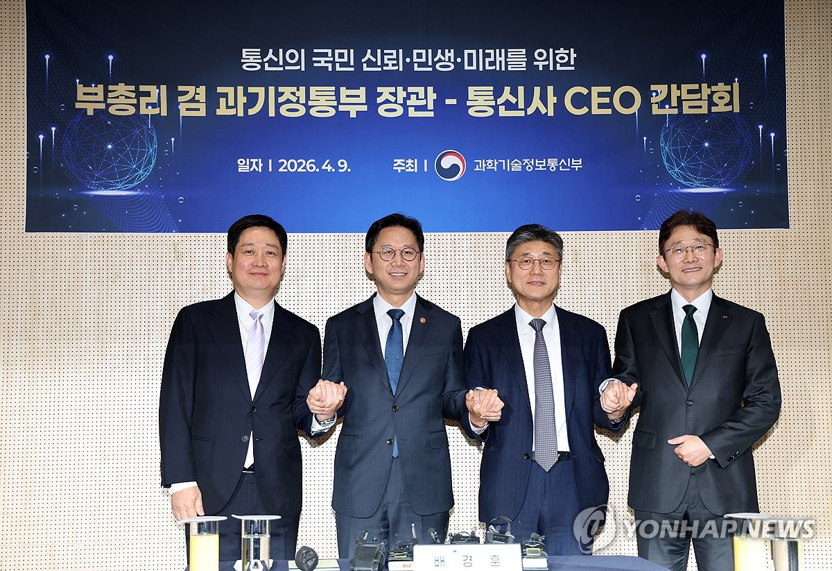 (서울=연합뉴스) 박동주 기자 = 9일 서울 강남구 한국과학기술회관에서 열린 '부총리 겸 과학기술정보통신부 장관-통신사 CEO 간담회'에서 배경훈 부총리 겸 과학기술정보통신부 장관 등 참석자들이 기념촬영하고 있다. 왼쪽부터 홍범식 LG유플러스 대표, 배경훈 부총리 겸 과학기술정보통신부 장관, 정재헌 SK텔레콤 대표, 박윤영 KT 대표. 2026.4.9 pdj6635@yna.co.kr