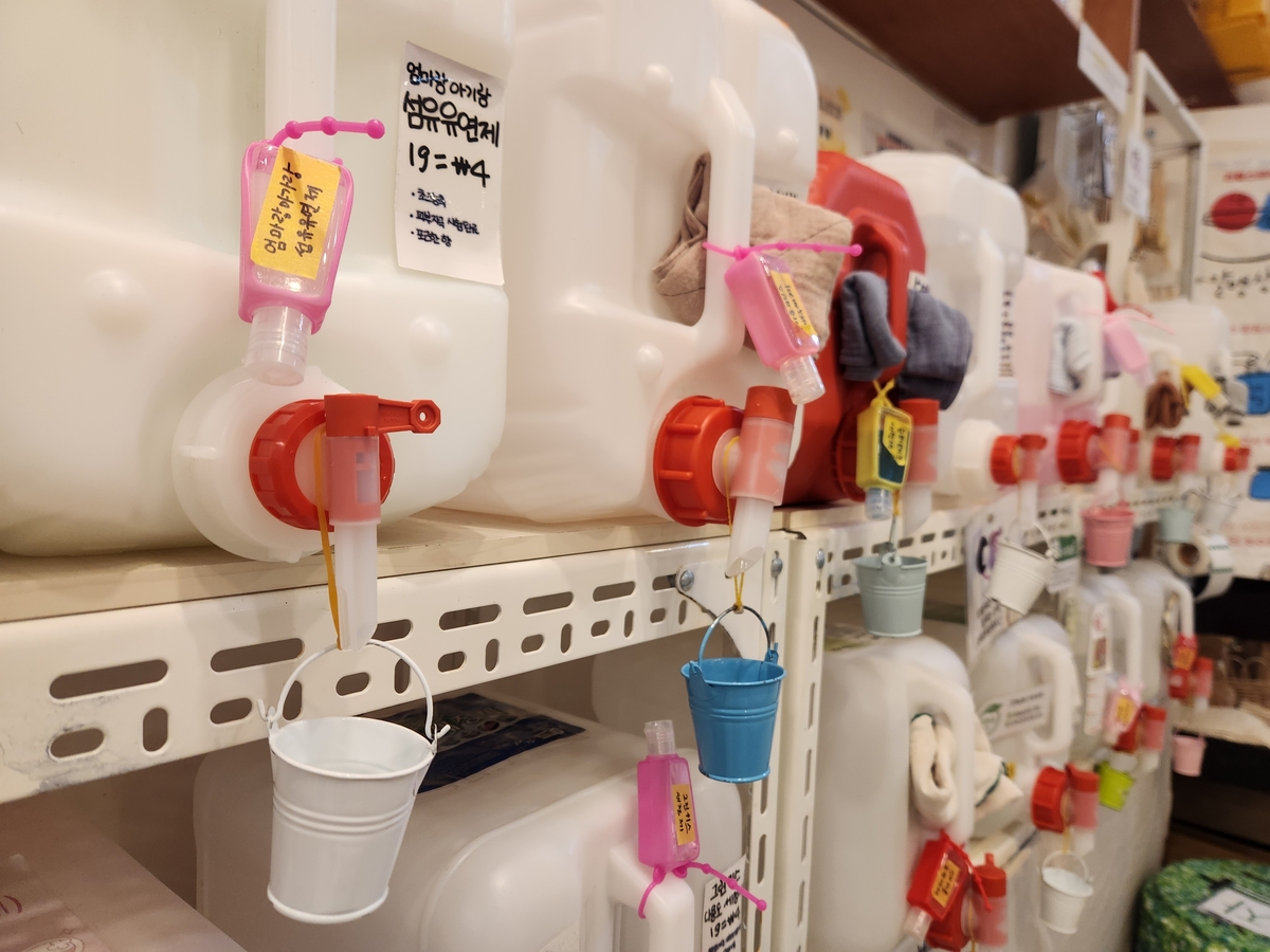 문을 열고 들어서자 줄지어 선 대형 말통들이 가장 먼저 손님을 맞이했다. 섬유유연제부터 방향제, 바디워시, 클렌징워터, 로션까지, 말통에 담긴 다양한 리필제품은 1g 단위로 알뜰한 판매가 이뤄진다. 플라스틱 쓰레기를 줄이기 위한 아이디어다. 손님들은 직접 챙겨오거나 매장 곳곳에 비치된 다회용기에 필요한 만큼 화장품이나 세탁용품을 담아 갔다.