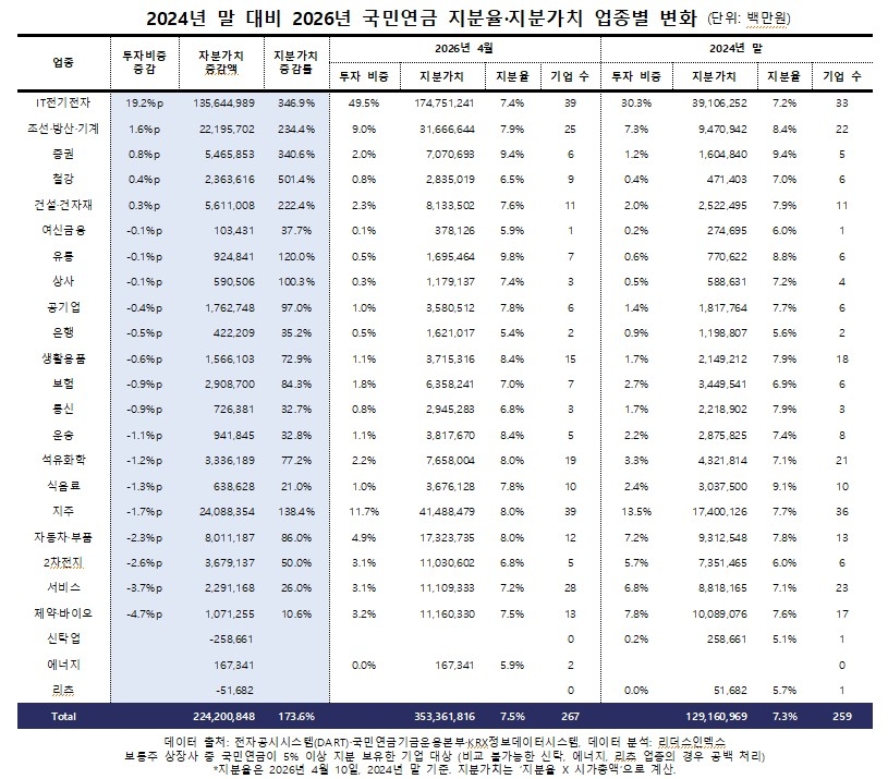 14일 기업분석연구소 리더스인덱스는 국민연금이 5% 이상 지분을 보유하고 공시한 267개 상장사에 대한 2024년 말 대비 2026년 4월 보유지분율 변화를 분석했다.