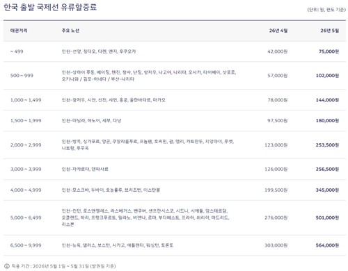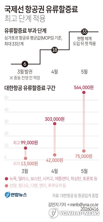 (서울=연합뉴스) 임성호 기자 = 중동 전쟁이 한 달 반 넘게 이어지면서 오는 5월 발권하는 국제선 항공권에 부과되는 유류할증료가 역대 최고 단계로 뛰어올랐다.