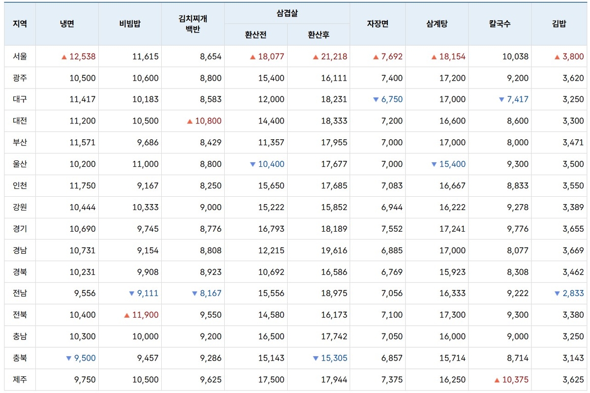 전국에서 칼국수 가격이 가장 비싼 곳은 제주(1만375원)였으며, 비빔밥은 전북(1만1천900원)이 서울보다 비쌌다.