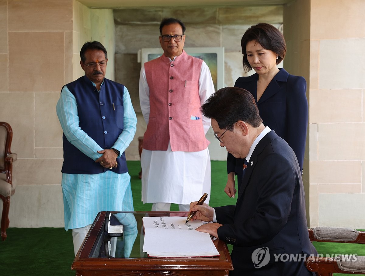 (뉴델리=연합뉴스) 김도훈 기자 = 이재명 대통령이 20일(현지시간) 인도 뉴델리 간디 추모공원에서 방명록을 작성하고 있다. 2026.4.20 superdoo82@yna.co.kr