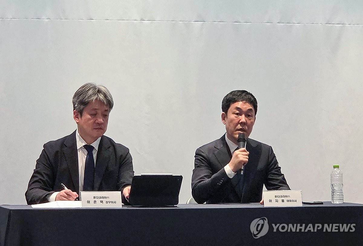 (서울=연합뉴스) 임성호 기자 = 일본 자동차 브랜드 혼다의 국내 판매 법인인 혼다 코리아 이지홍 대표이사(오른쪽)가 23일 서울 강남구 코엑스에서 올해 한국 시장에서의 자동차 판매 사업 종료 관련 기자회견을 하고 있다. 2026.4.23 sh@yna.co.kr