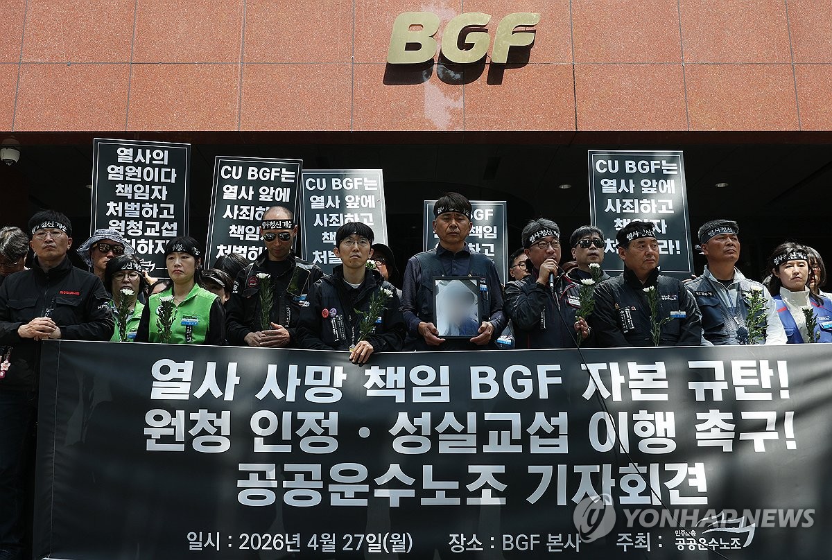 (서울=연합뉴스) 이지은 기자 = 민주노총 공공운수노조 조합원들이 27일 서울 강남구 BGF리테일 본사 앞에서 기자회견을 열고 BGF리테일의 화물연대 조합원 사망에 대한 책임 및 원청 인정, 성실교섭 이행을 촉구하고 있다. 2026.4.27 jieunlee@yna.co.kr