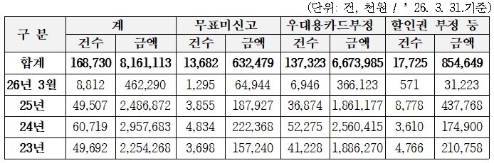 적발된 부정 승차는 ▲ 2023년 4만9천692건(부가금 22억5천426만원) ▲ 2024년 6만719건(부가금 29억5천768만원) ▲ 2025년 4만9천507건(부가금 24억8천687만원)이다.