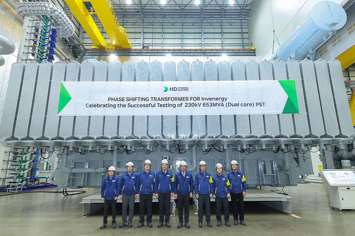 (서울=연합뉴스) HD현대의 전력기기 및 에너지설루션 계열사인 HD현대일렉트릭이 국내 최대 용량인 230㎸ 653MVA급 위상조정변압기의 제작에 성공했다고 2일 밝혔다. 사진은 HD현대일렉트릭 230㎸ 653MVA 위상조정변압기 제작 성공 기념식. 2025.4.2 [HD현대일렉트릭 제공. 재판매 및 DB 금지] photo@yna.co.kr