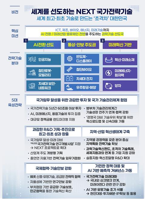 정부는 국가 전략기술 분야 정부 R&D 투자를 5년간 60조원 이상으로 확대하고, 내년에는 AI 인프라, 차세대 AI기술, 미래에너지, 과학기술·AI 융합기술에 집중 투자하기로 했다.